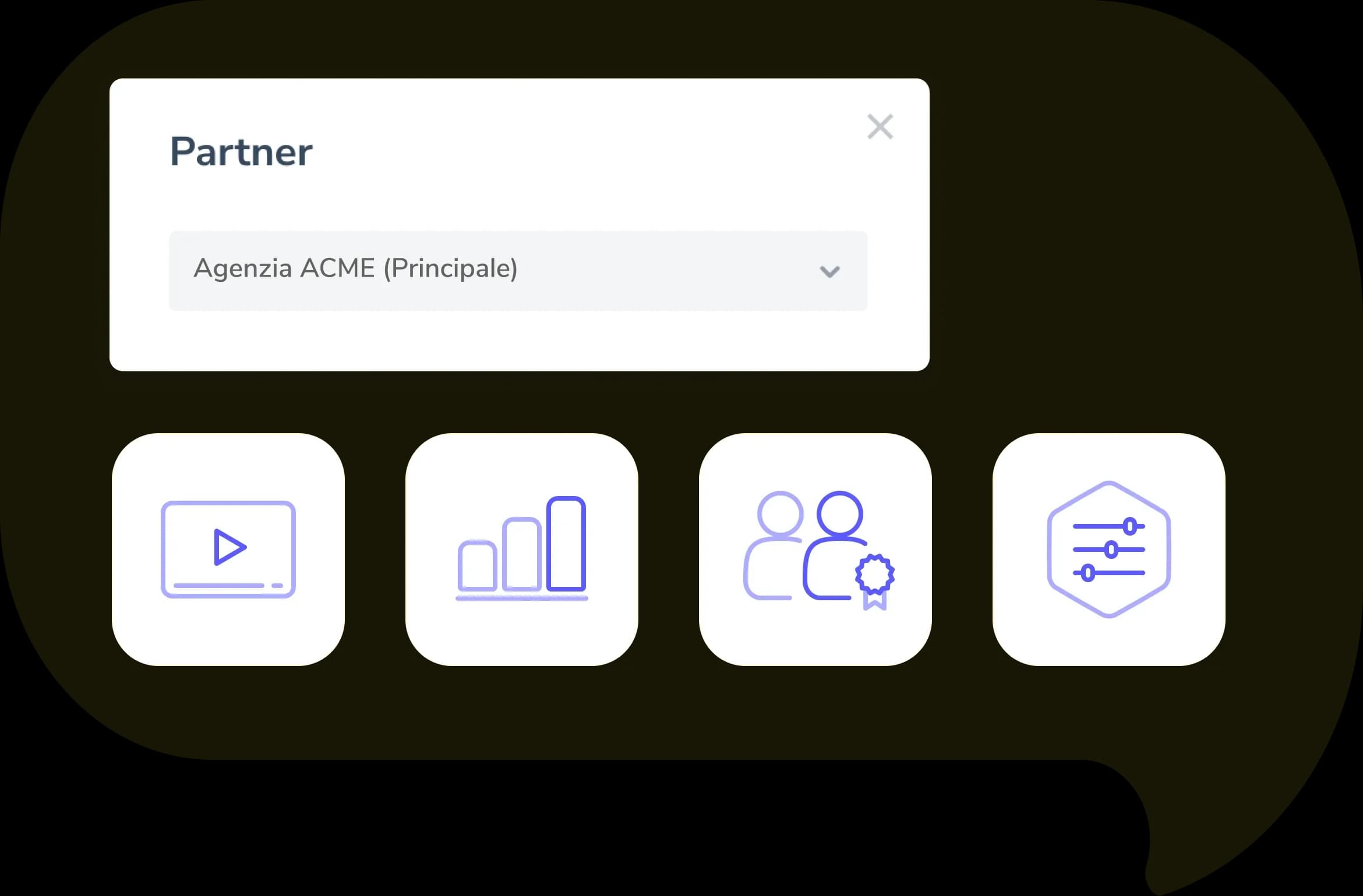 Puoi configurare aziende partner in modalità whitelabel, ovvero con un brand e dominio personalizzato e autonomo, oppure agganciarle direttamente sotto il tuo marchio, per una gestione ramificata della tua azienda.
