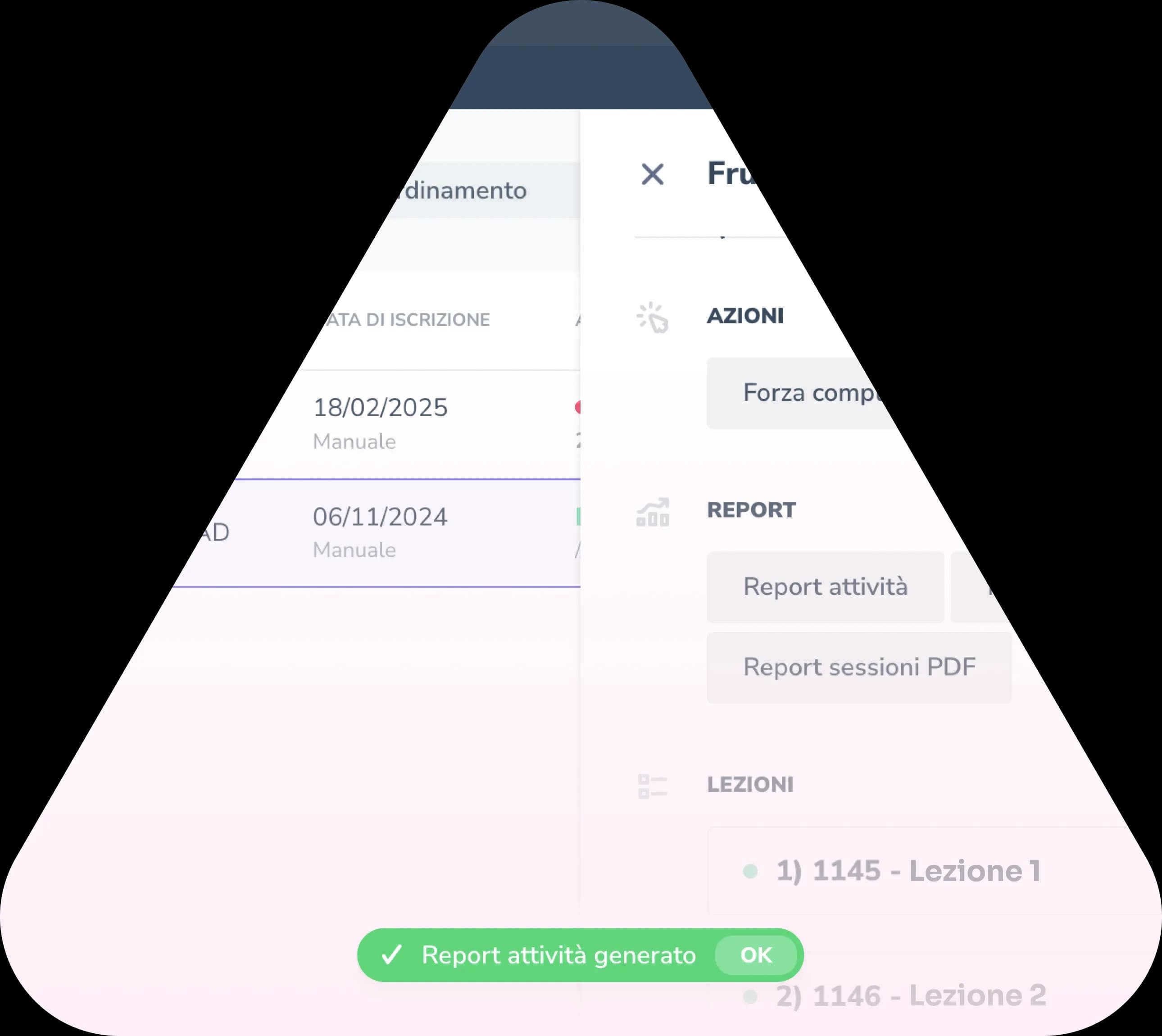 È possibile scegliere tra report di avanzamento che tracciano eventi come accessi, presenze, attività di tutor e docenti, durata e date. Il report partecipante riunisce in un unico documento dati personali, corso seguito, test eseguiti, tentativi, punteggi e tempi di fruizione.