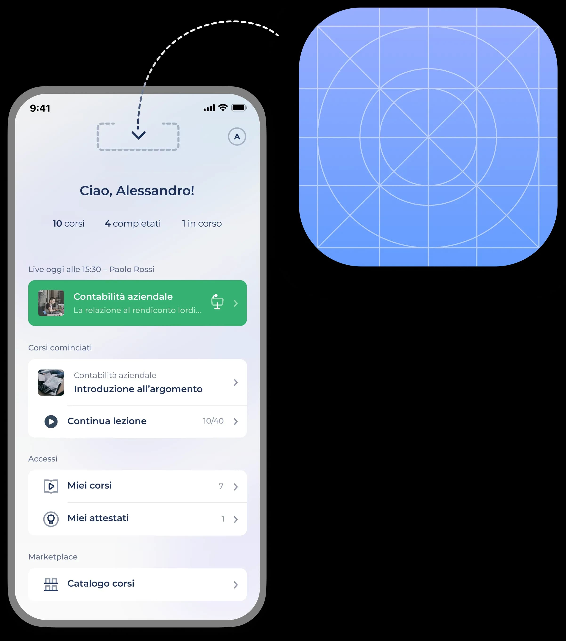 Amplifica la visibilità dei tuoi corsi e vendili attraverso un sito e-commerce personalizzato per la tua organizzazione. Con un flusso studiato ad hoc ed un'esperienza di acquisto semplificata, i tuoi clienti potranno comprare in autonomia i contenuti, pagare online ed iniziare subito la formazione.